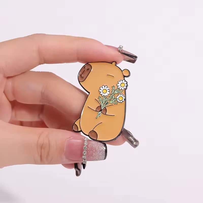 Ontdek de magie van de capibara met deze schattige en unieke pin! Met zijn bruine vacht en lieflijke madeliefjes brengt hij een wereld van vreugde overal waar je gaat. Of het nu op je tas, jas of rugzak is, deze capybara pin is een ware blikvanger. 🌟